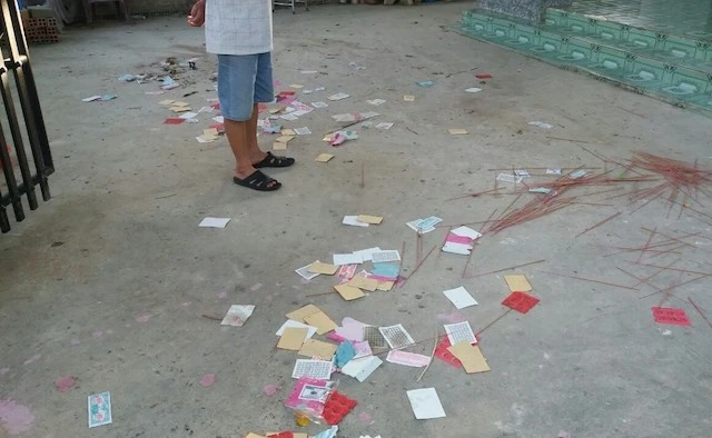 Công an huyện Tiểu Cần (tỉnh Trà Vinh) vừa mời Ngô Hồng Thao (24 tuổi) và Tô Viết Phong (18 tuổi, cùng ngụ tỉnh Hà Tĩnh, hiện tạm trú tại huyện Châu Thành) lên làm việc để làm rõ việc dùng mắm tôm và nước sơn, rải vàng mã để đi đòi nợ.