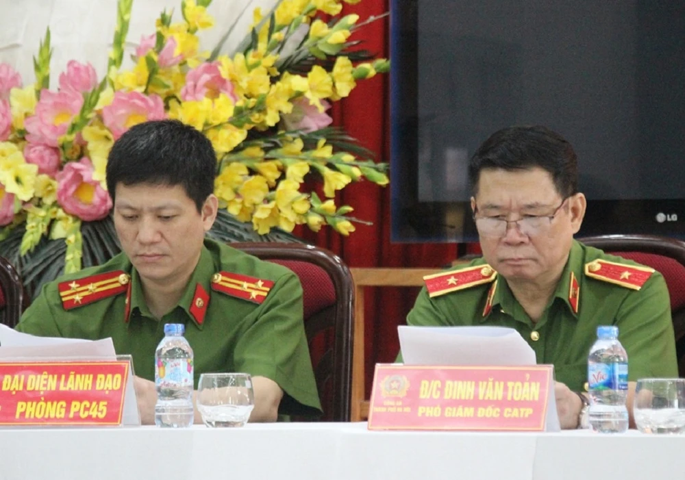 Lãnh đạo Công an TP Hà Nội và PC45 tại buổi cung cấp thông tin về vụ án. Ảnh: TUYẾN PHAN.
