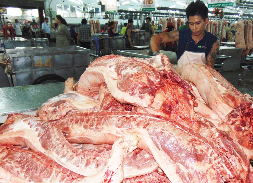 Thịt heo tươi được kinh doanh trong chợ đầu mối Hóc Môn (TP.HCM). Ảnh: TRẦN NGỌC