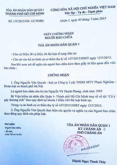 GCN bào chữa được TAND quận 1 cấp cho LS sau sự kiện “LS lên Facebook nói xấu tòa?”. Ảnh: NGÂN NGA