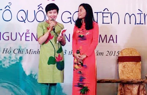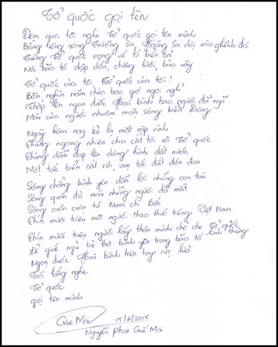 Nhà thơ Nguyễn Phan Quế Mai (trên) trong buổi ra mắt tập thơ “Tổ quốc gọi tên mình” và bản viết tay bài thơ được dùng để in trong tập thơ này. Ảnh: VIẾT THỊNH