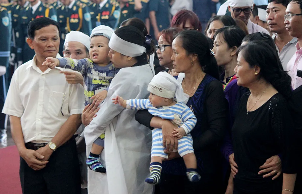 Nhiều người không cầm được nước mắt khi nhìn thấy cảnh hai đứa con anh Minh còn thơ dại cứ với tay về hướng linh cữu của bố trong giờ truy điệu