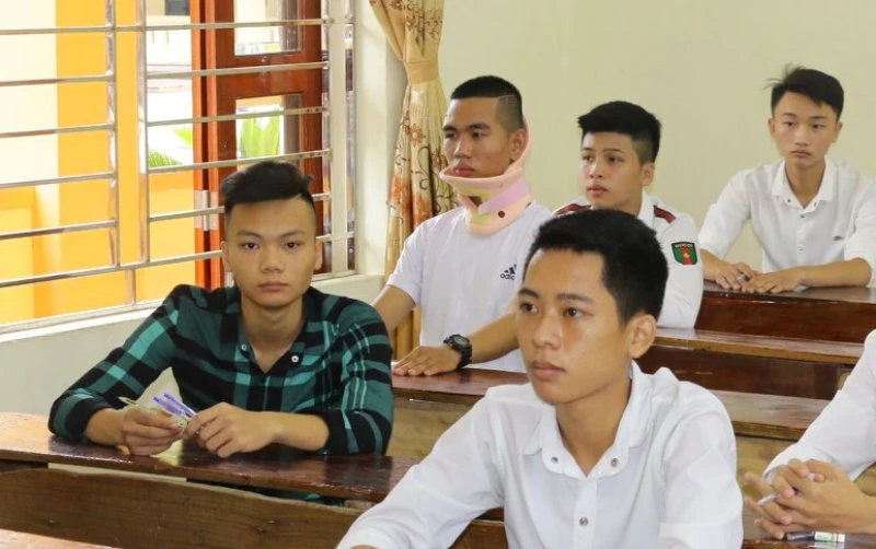 Thí sinh Lê Văn Hoàng đến phòng thi làm bài với chiếc nẹp cổ.