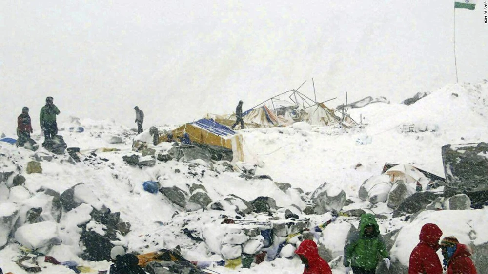 Trận động đất ngày 25-4 vừa qua cũng gây ra một trận lở tuyết lớn trên đỉnh núi Everest (Ảnh: AP)
