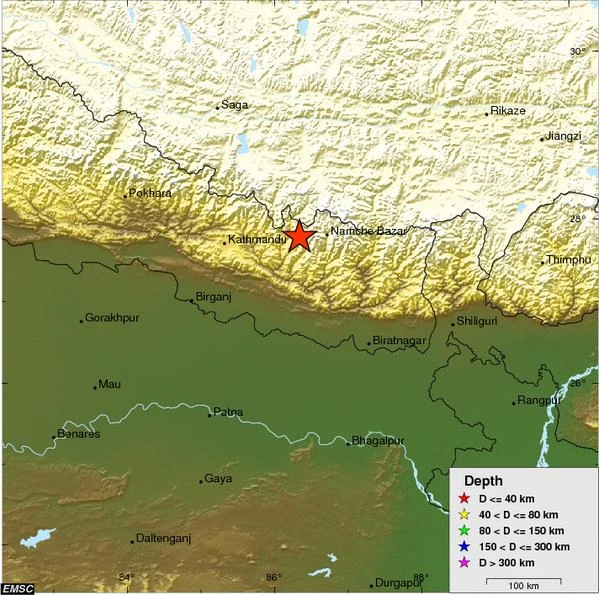 Tâm chấn của vụ động đất nằm ở độ sâu 19km, ở vị trí khoảng 68km về phía Tây thị trấn Namche Bazar, nằm gần ngọn núi Everest.