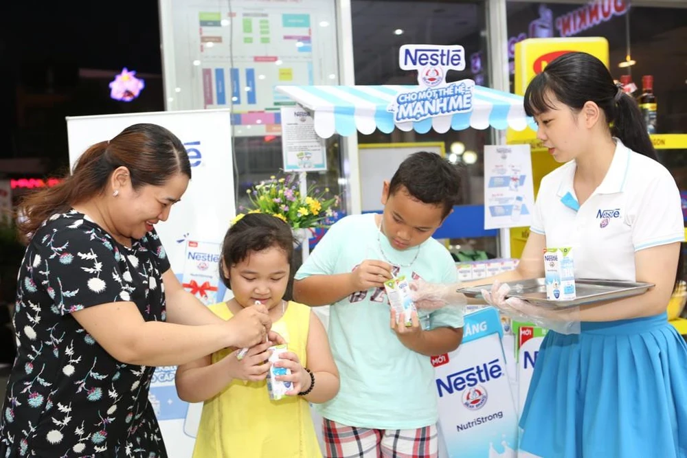 Các bé đang uống thử sữa nước Nestlé ít đường.