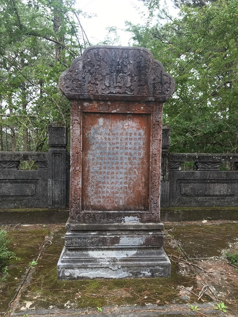 Bia đá khắc chữ Hán ở khoảnh sân của khu lăng mộ. Ảnh: THANH THUỲ