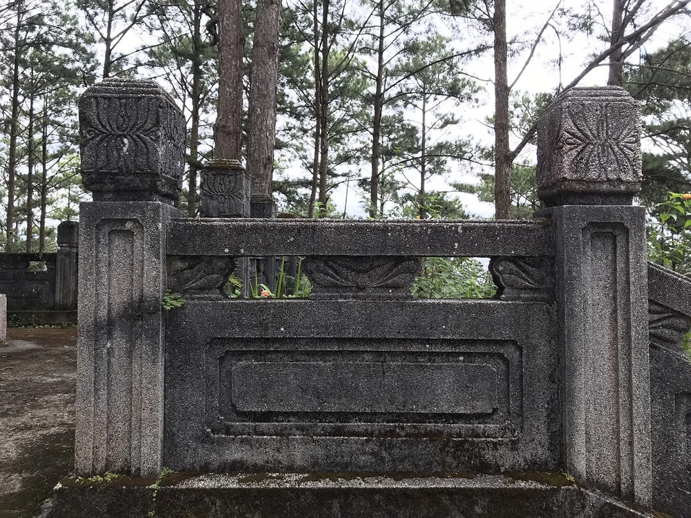 Một góc dãy hành rào bao xung quanh phía ngoài khi lăng mộ chính. Phần khối phía trên của hàng rào có hoạ tiết hình hoa sen cách điệu. Ảnh: THANH THUỲ