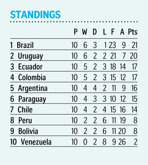 Khu vực Nam Mỹ chọn bốn đội đầu vào vòng chung kết World Cup, đội thứ năm đi đá play off với đội của châu Đại Dương. Argentina hiện nay “nắm suất” play off.
