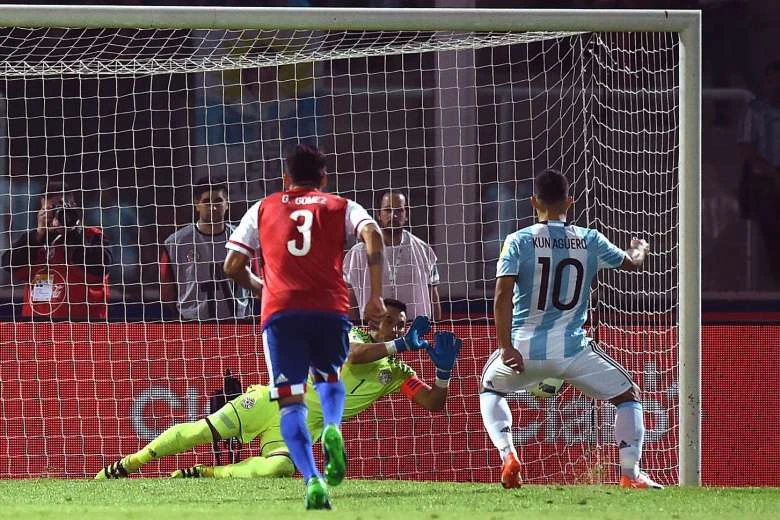 Aguero (10) ghi bàn ầm ầm cho Man. City nhưng sút phạt đền cho Argentina cũng không thành.