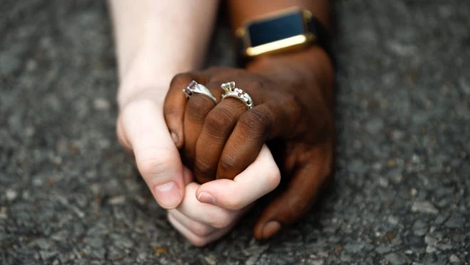 Hai người biểu tình, một da màu, một da trắng nắm tay nhau khi đang xuống đường ở TP Nashville, bang Tennessee. Ảnh: USA TODAY