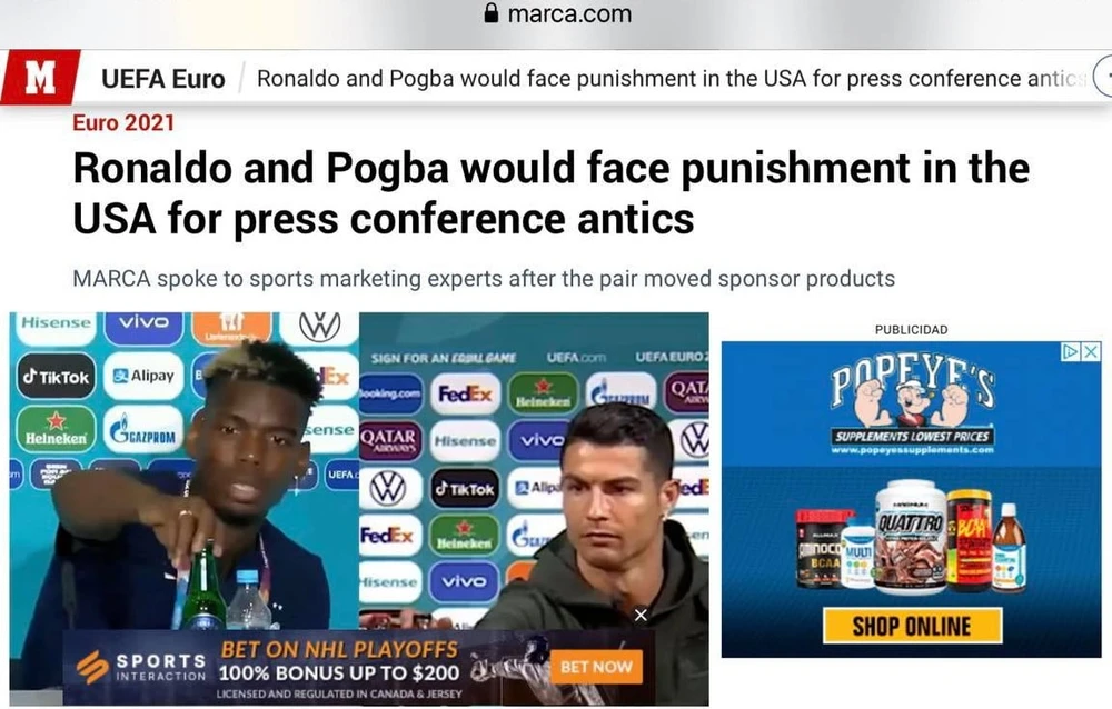 Mạnh mẽ hơn, Carlos Canto - Giám đốc điều hành của công ty môi giới thể thao SPSG còn nói với marca.com rằng: "Điều này ở Mỹ sẽ không bao giờ xảy ra. Nếu chuyện như thế này xảy ra ở NFL hoặc NBA (hai giải hockey và bóng rổ nhà nghề ở Mỹ), cầu thủ đó đã bị xử phạt nặng. Các nhà tổ chức phải bảo vệ quyền lợi nhà tài trợ, bởi nhà tài trợ là nguồn sống của tất cả các thành viên liên quan đến giải đấu”. Rõ ràng, Ronaldo cùng Pogba đều là thành viên liên quan đến giải đấu Euro 2020.