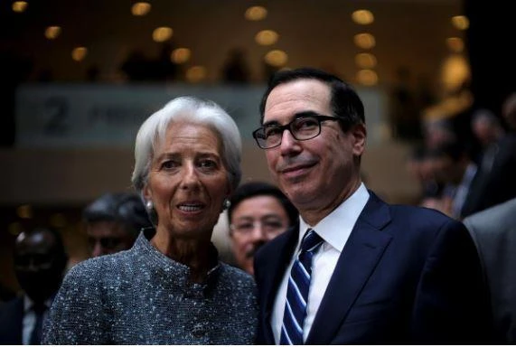 Bộ trưởng Tài chính Mỹ Steven Mnuchin và Giám đốc điều hành Quỹ tiền tệ quốc tế IMF, bà Christine Lagarde, tại hội nghị Mùa xuân của IMF và Ngân hàng thế giới ngày 13-4. Ảnh REUTERS