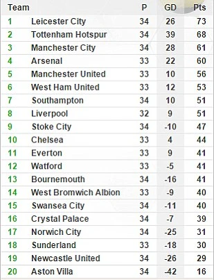BXH giải Ngoại hạng Anh sau vòng 34: