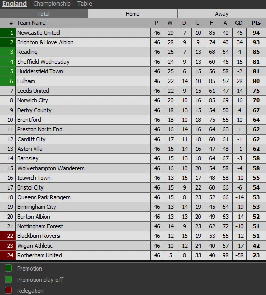 Kết thúc 46 vòng đấu ở giải Championship, hai đội Newcastle và Brighton & Hove Albion đã giành hai chiếc vé chính thức lên chơi ở Premier League. Chiếc vé còn lại là cuộc cạnh tranh giữa bốn đội Reading, Sheffield Wednesday, Huddersfield Town và Fulham. Bốn đội này sẽ đá play-off để chọn ra đội còn lại lên chơi ở Ngoại hạng Anh cùng với hai đội kể trên.