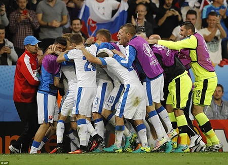 Niềm vui của các cầu thủ Slovakia sau đi đánh bại tuyển Nga để tiếp tục hy vọng tại Euro 2016.