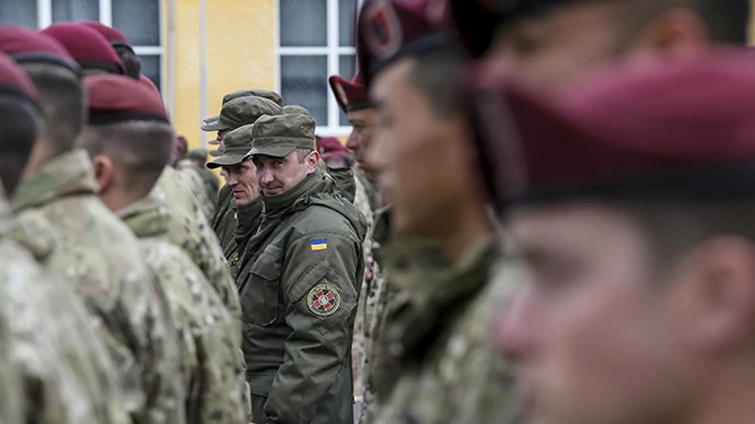 Lữ đoàn dù 173 của quân đội Mỹ và Lực lượng Vệ binh Quốc gia Ukraine tham dự một buổi lễ khai mạc cuộc tập trận chung hồi tháng 4-2015