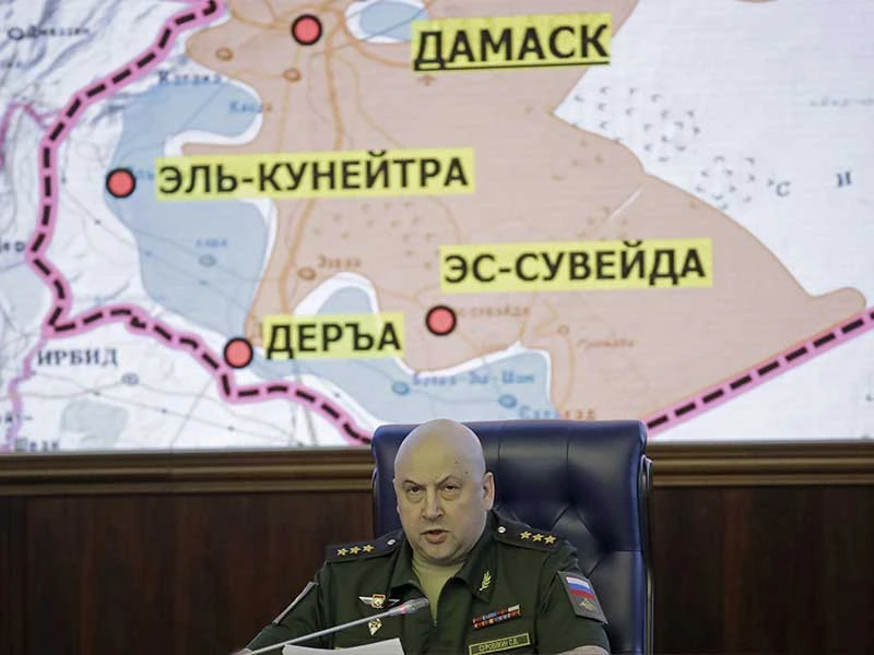 Thượng tướng Sergei Surovikin, Tư lệnh lực lượng vũ trang Nga đang hoạt động tại Syria, trả lời họp báo tại Bộ Quốc phòng Nga ngày 9-6. Ảnh: AP
