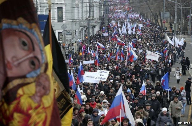 Một cuộc tuần hành ở Moscow ủng hộ chính sách của Tổng thống Nga Vladimir Putin về Crimea và Ukraine. Ảnh: Reuters