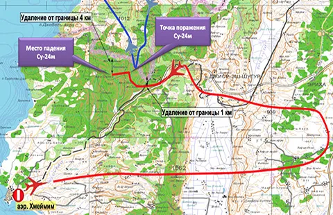 Cùng ngày, Bộ Quốc phòng Nga đã công bố biểu đồ thể hiện đường bay của máy bay ném bom Su-24 của Nga bị máy bay tiêm kích F-16 của Thổ Nhĩ Kỳ bắn rơi hôm trước đó.