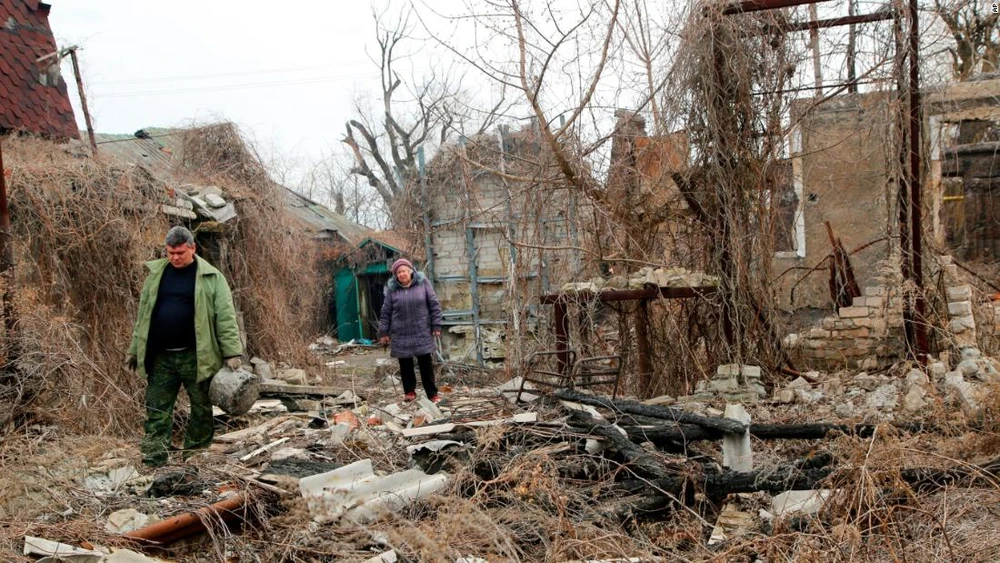 Người dân tìm kiếm đồ đạc trong ngôi nhà bị phá hủy của họ gần tiền tuyến ở miền Đông Ukraine. Ảnh: CNN