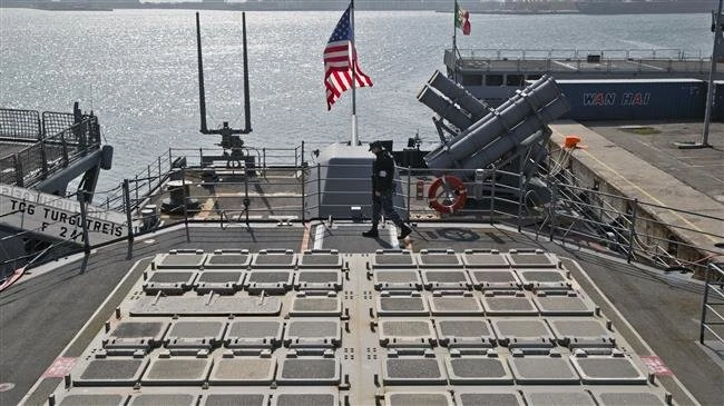 Một lính hải quân Mỹ đứng cạnh các bệ phóng tên lửa trên boong tàu USS Vicksburd ở cảng Constanta, Romania. Ảnh: AP