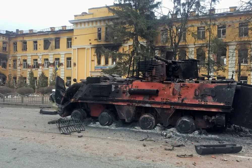 Một xe bọc thép của Ukraine bị phá hủy sau khi thành phố Kharkiv bị pháo kích. Ảnh: REUTERS