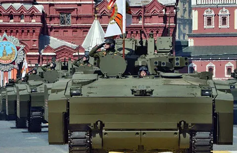 Phần diễu hành của khí tài quân sự gồm các loại xe quân sự từng tham gia Chiến tranh thế giới thứ hai và các khí tài hiện đại. Trong số này có xe tăng thế hệ mới nhất T-14 Armata lần đầu tiên được giới thiệu trước công chúng.
