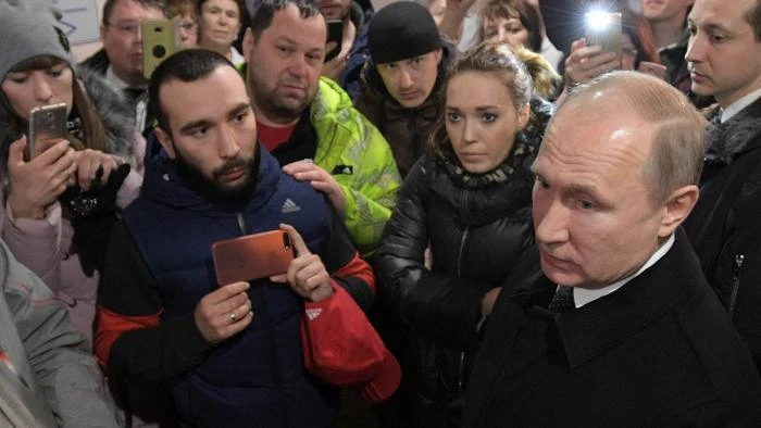Tổng thống Nga Vladimir Putin gặp gia đình những người mất tích trong vụ hỏa hoạn ở Kemerovo hôm 27-3. Chuyên gia cho rằng vì sự kiện này nên Nga hoãn tung ra biện pháp trả đũa. Ảnh: REUTERS