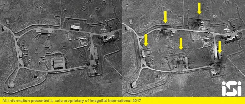 Nhà xưởng trong căn cứ Shayrat, tỉnh Homs, Syria trước và sau khi bị tên lửa Mỹ tấn công sáng 7-4 (giờ VN). Ảnh: REUTERS