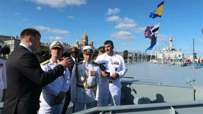 Tư lệnh hải quân Iran – chuẩn đô đốc Hossein Khanzadi (thứ 2 từ trái sang) thăm Nga ba ngày nhân lễ kỷ niệm Ngày truyền thống hải quân Nga hôm 28-7. Ảnh: Press TV