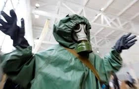 Một học sinh đeo mặt nạ khí và đồ bảo vệ tham gia cuộc thi về phòng thủ dân sự giữa các trường học địa phương tại TP Stravropol, miền nam nước Nga vào 2-2-2011
