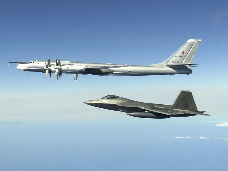 Máy bay ném bom Tu-95 của Nga (trên) bị tiêm kích F-22 Raptor của Mỹ chặn ngoài khơi Alaska tháng 6-2020. Ảnh: North American Aerospace Defense Command/ AP