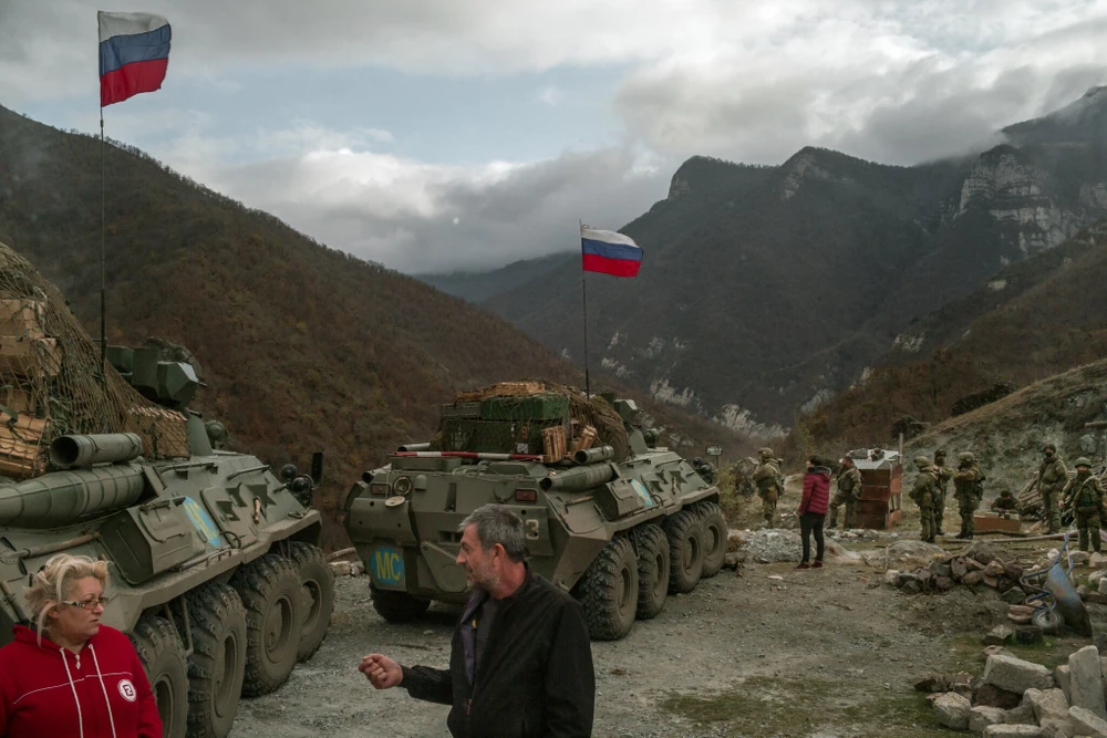 Lực lượng gìn giữ hòa bình Nga gần tu viện Dadivank, huyện miền núi Kelbajar hôm 13-11. Ảnh: THE NEW YORK TIMES