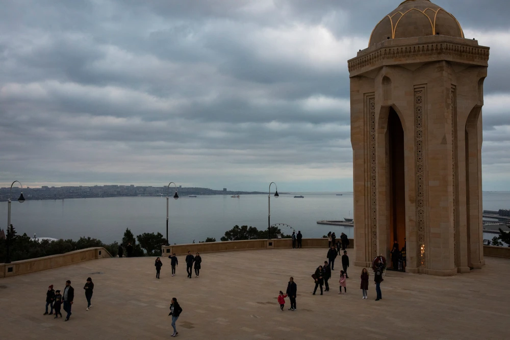 Người Azerbaijan hôm 13-11 đến tượng đài ngọn lửa vĩnh cửu nhìn xuống thủ đô Baku để tưởng nhớ những người đã hy sinh trong cuộc chiến tại Nagorno-Karabakh. Ảnh: THE NEW YORK TIMES