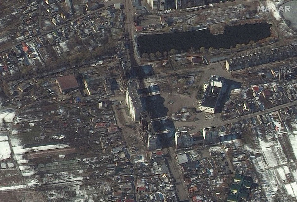Một hình ảnh vệ tinh cho thấy các tòa nhà dân cư bị hư hại sau khi Nga tấn công khu định cư Borodyanka. Ảnh: MAXAR