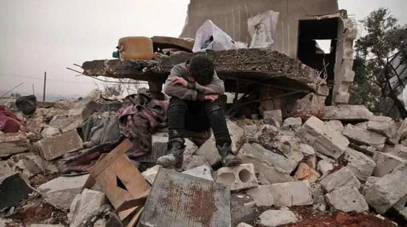 Một cậu bé Syria ngồi khóc ở làng Kafr Taal, tỉnh Aleppo, Syria. Ảnh: AFP