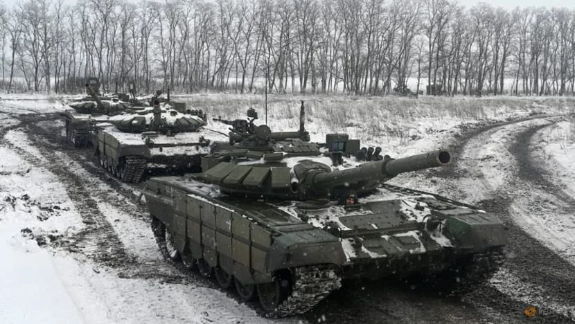 Xe tăng T-72B3 tập trận ở vùng Rostov, Nga ngày 27-1-2022. Ảnh: REUTERS