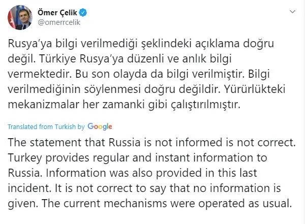 “Thổ Nhĩ Kỳ vẫn đang cung cấp thông tin thường xuyên và nhanh chóng cho Nga. Chúng tôi cũng thông báo cho họ về sự việc mới nhất đó. Thật không đúng khi nói chúng tôi không chia sẻ thông tin. Các cơ chế liên lạc vẫn được sử dụng như mọi khi”, ông Celik viết trên Twitter.