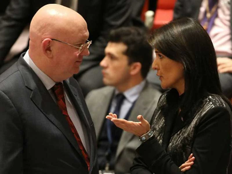 Đại sứ Nga tại LHQ Vasily Nebezia và người đồng cấp Mỹ Nikki Haley trong phiên họp tại HĐBA LHQ. Ảnh: GETTY IMAGES