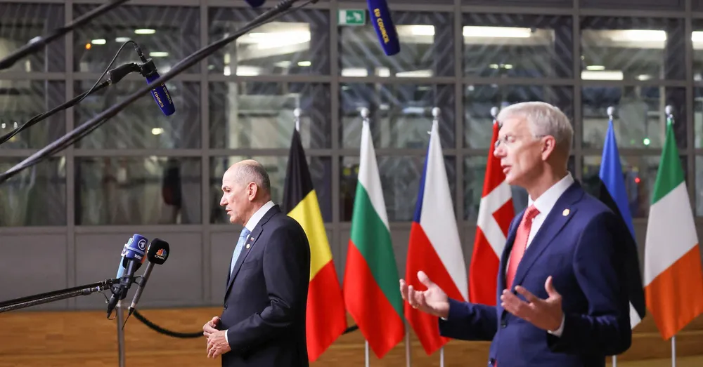 Thủ tướng Slovenia Janez Jansa và Thủ tướng Latvia Arturs Krisjanis Karins. Ảnh: KENZO TRIBOUILLARD / REUTERS