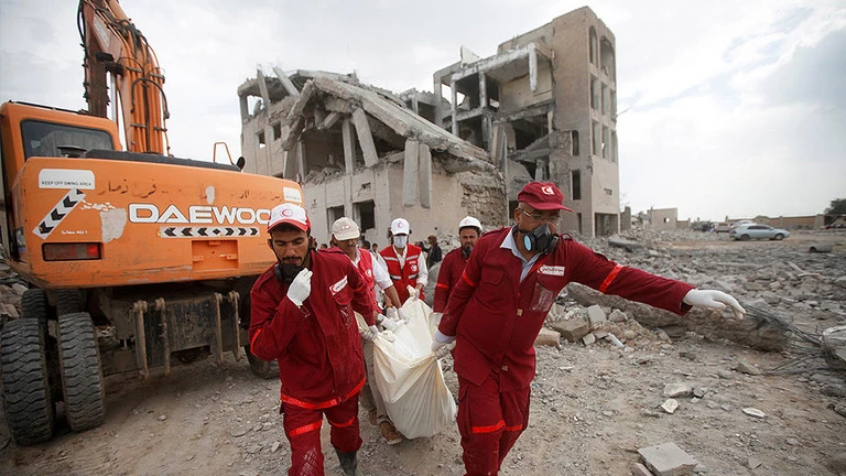 Các nhân viên cứu hộ của Trăng lưỡi liềm đỏ vận chuyển thi thể nạn nhân trong cuộc không kích do liên quân Saudi Arabia dẫn đầu nhằm vào một nhà tù ở Dhamar, Yemen hôm 1-9. Ảnh: REUTERS