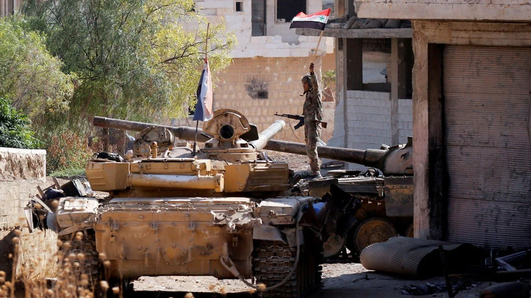 Xe tăng của quân đội Syria cắm chốt tại một trạm tập kết ở thị trấn Khan Sheikhun, tỉnh Idlib. Ảnh: RT