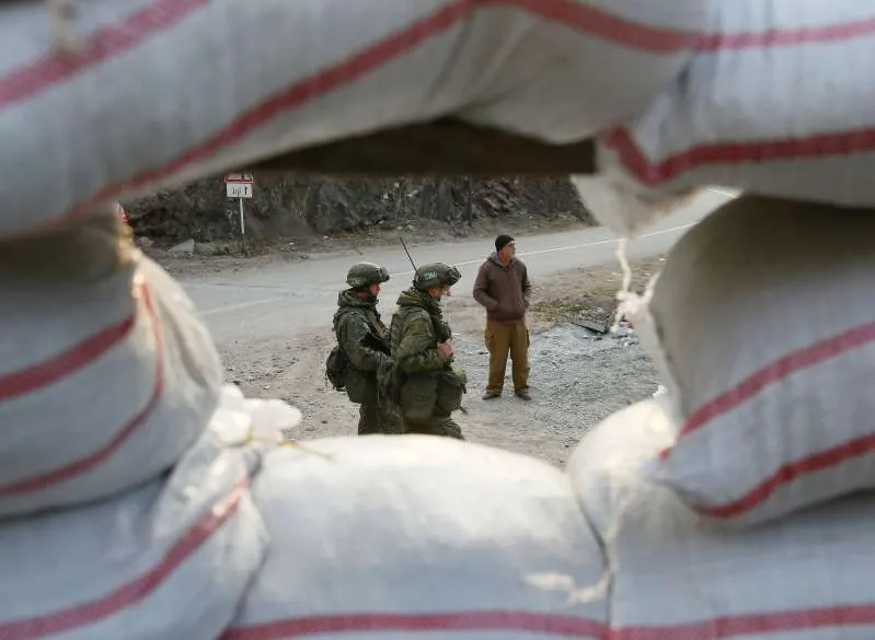 Lực lượng gìn giữ hòa bình Nga tại tu viện Dadivank, huyện Kalbajar- khu vực Armenia sắp bàn giao cho Azerbaijan. Ảnh: Stringer/REUTERS