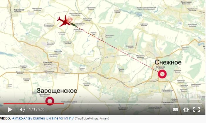 Hình ảnh cắt từ video minh họa thí nghiệm của Tập đoàn tên lửa Buk của Nga Almaz-Antey. Theo đó, họ bác bỏ kết luận của Ủy ban An toàn Hà Lan và nói rằng tên lửa trúng vào phần mũi (chứ không phải phần buồng lái đã được kết luận) của máy bay Boeing 777