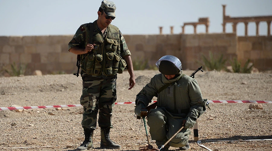 Lực lượng Nga rà mìn ở thành cổ Palmyra. Ảnh: RT