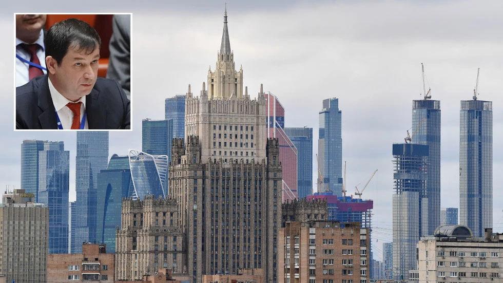 Tòa nhà Bộ Ngoại giao Nga ở quảng trường Smolenskaya-Sennaya (Mosow). Ảnh nhỏ là ông Dmitry Polyanskiy – Phó Đại diện thường trực thứ nhất của Nga tại Liên Hợp Quốc. Ảnh: Sputnik / Alexey Maishev/REUTERS / Carlo Allegri
