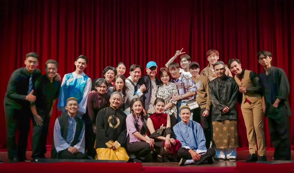 NSND Việt Anh và diễn viên Trấn Thành chúc mừng đêm diễn thành công của Phương Thảo và đồng nghiệp trong vở Lôi Vũ.
