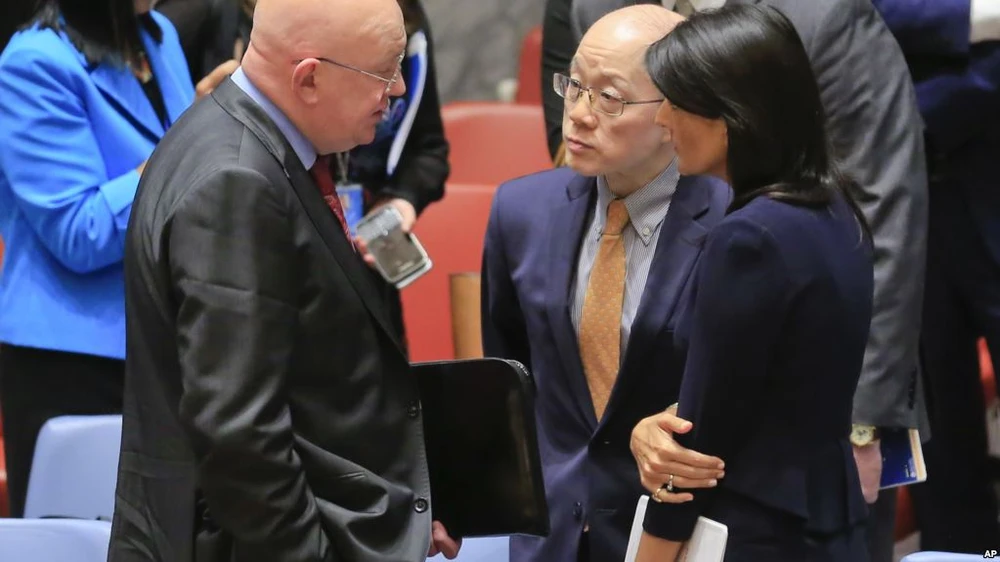 Đại sứ Nga tại LHQ Vasily Nebenzya (trái), Đại sứ Trung Quốc Lưu Kết Nhất (giữa) và bà Nikki Haley, Đại sứ Mỹ, trao đổi bên lề một phiên họp của Liên Hiệp Quốc vào ngày 4-9-2017. Ảnh: AP
