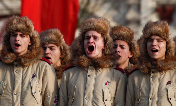 Thành viên Đội thanh niên thiếu sinh quân yêu nước toàn Nga hô khẩu hiệu. Ảnh: Reuters